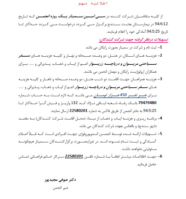 ادامه مطلب ...در این جلسه مسائل جاری انجمن و مباحث جدی در مورد برگزاری کنگره سال 1395 مطرح گردید .همچنین در رابطه با نحوه برگزاری کنفرانس انجمن در سنندج و اعطای تسهیلات به شرکت کنندگان دراین کنفرانس مطالبی عنوان شد که به زودی اطلاع رسانی خواهد گردید.