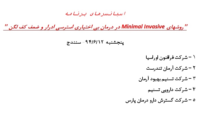 کنفرانس روشهای minimal invasive در درمان بی اختیاری ادراری در تاریخ 12 شهریور ماه با حضور 100 نفر از فوق تخصصین کلیه کودکان، متخصص اورولوژی، زنان و زایمان و ماماها با 25/4 امتیاز آموزش مداوم در بیمارستان بعثت سنندج برگزار گردید. از نکات قابل توجه در این کنفرانس حضور اساتید برجسته اورولو ...