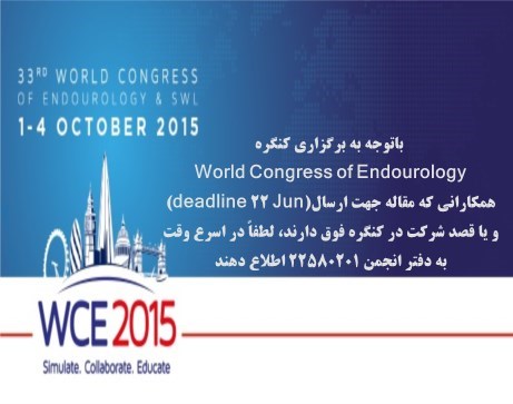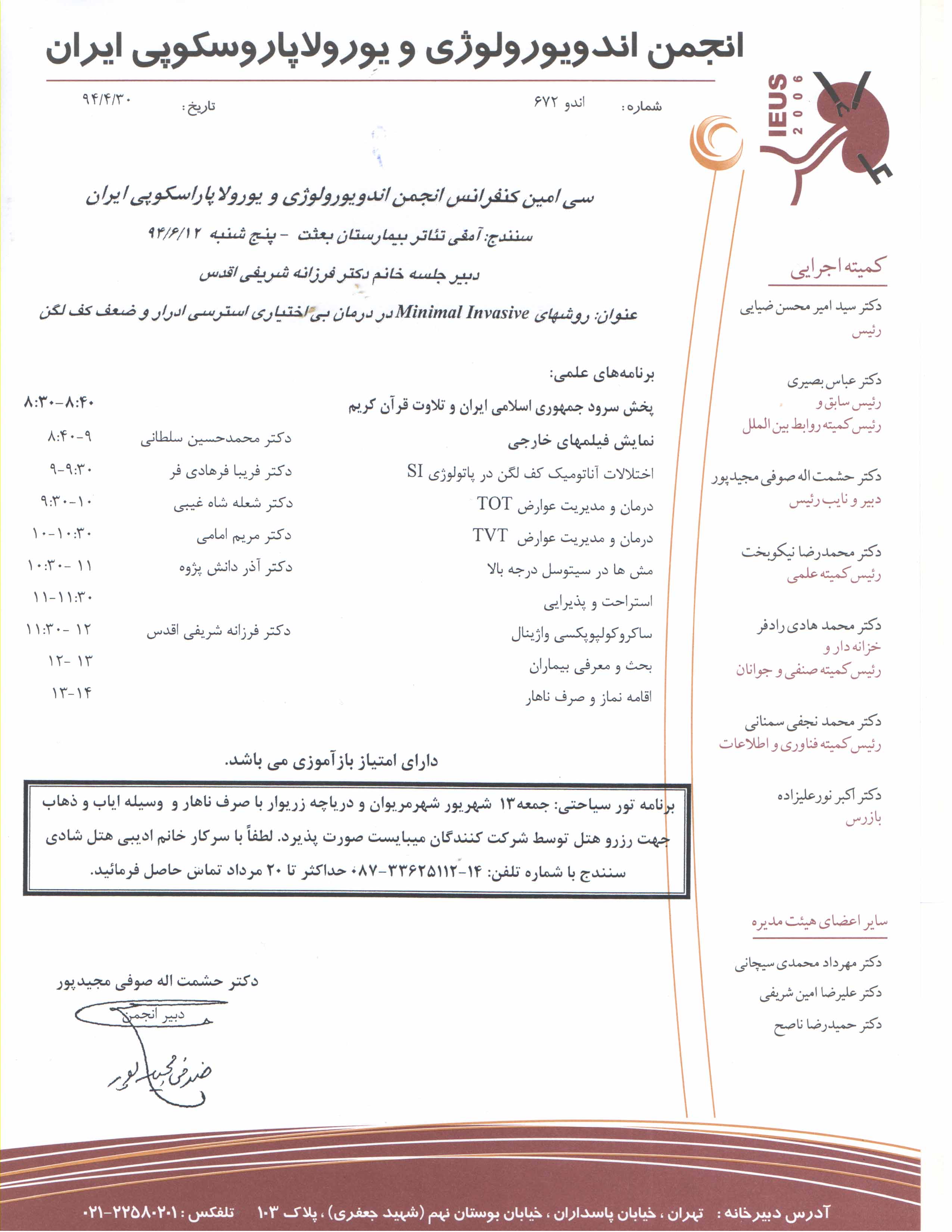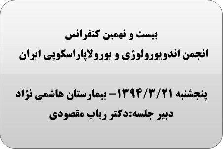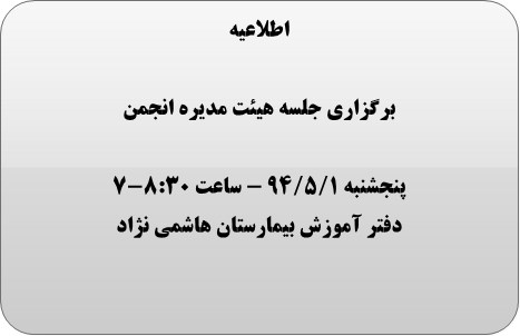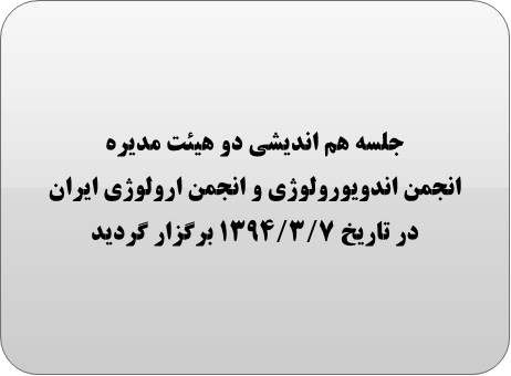 جلسه هیئت مدیره انجمن اندویورولوژی و یورولاپاراسکوپی ایران در روز پنجشنبه مورخ 94/5/1 از ساعت 8:30-7صبح در دفتر آموزش بیمارستان هاشمی نژاد تهران برگزار می گردد.