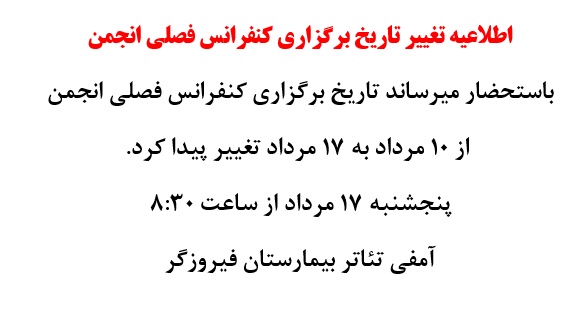 ادامه مطلب ...باستحضار میرساند تاریخ برگزاری کنفرانس فصلی انجمن از 10 مرداد به 17 مرداد تغییر پیدا کرد.