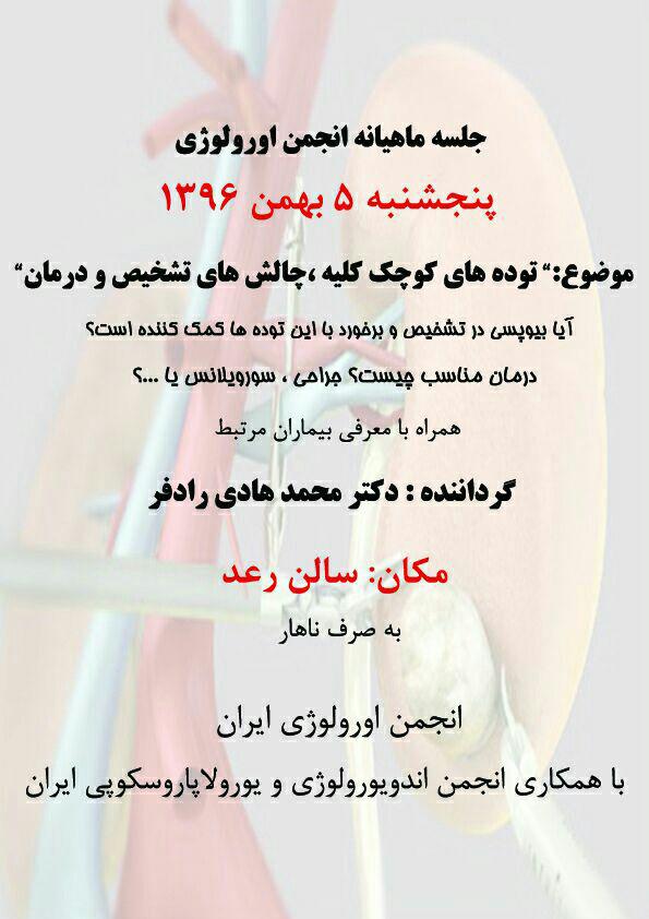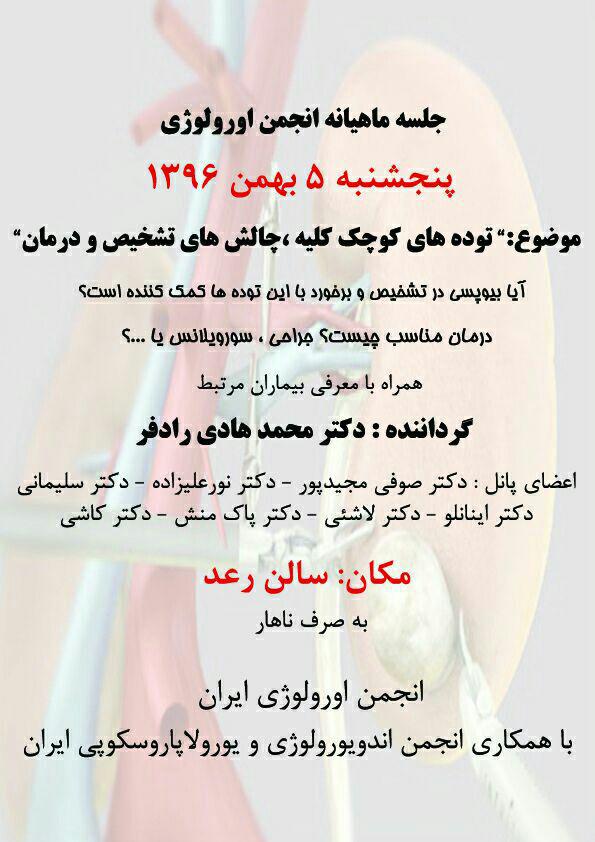 کنفرانس ماهیانه انجمن ارولوژی ایران با همکاری انجمن اندویورولوژی با عنوان " توده های کوچک کلیه "، پنجشنبه 5 بهمن ماه 1396 در سالن رعد برگزار گردید.